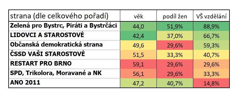 Zelená pro Bystrc, Piráti a Bystrčáci jsou také nejvzdělanější, titul tam má skoro 90% kandidátů. Nejslabší zastoupení otitulovaných mají radikální uskupení a ANO 2011. U stran vůdcovského typu to ale zase tolik nevadí, stačí že mají moudrého a vzdělaného vůdce.